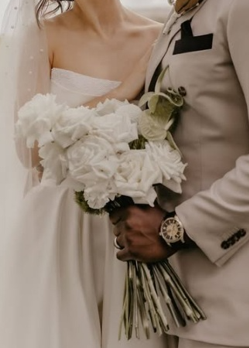 Our bridal bouquet is a timeless and elegant arrangement of premium blooms, thoughtfully designed to complement your wedding day. Crafted with a mix of seasonal filler and lush greenery, this bouquet adds a romantic touch, making it the perfect accessory for walking down the aisle in style. Stunning and graceful, it's a beautiful symbol of your special day.